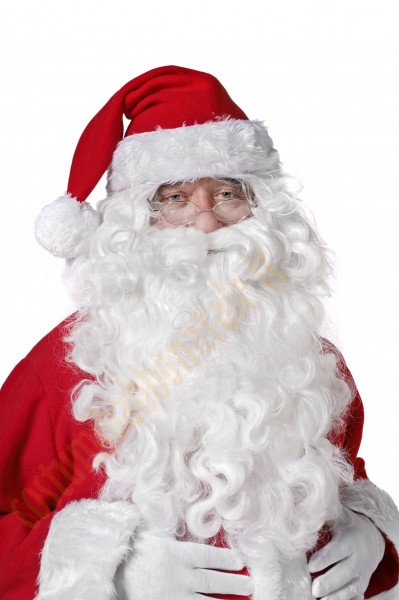 Taglie e opzioni sono disponibili anche altre barbe) è delicatamente ondulata, in colore bianco caldo, lo stesso della pelliccia del costume da Babbo Natale Super Deluxe ed è decorata con baffi rigogliosi. La barba viene fissata mediante due elastici e per maggior sicurezza può essere ulteriormente incollata con una colla speciale (fornita nel completo). I capelli della parrucca arrivano alle spalle e sicuramente coprono i propri capelli, le orecchie e gli elastici che fissano la barba, quindi Babbo Natale sarà irriconoscibile. Le sopracciglia adesive completano il travestimento. Prodotto tedesco.
